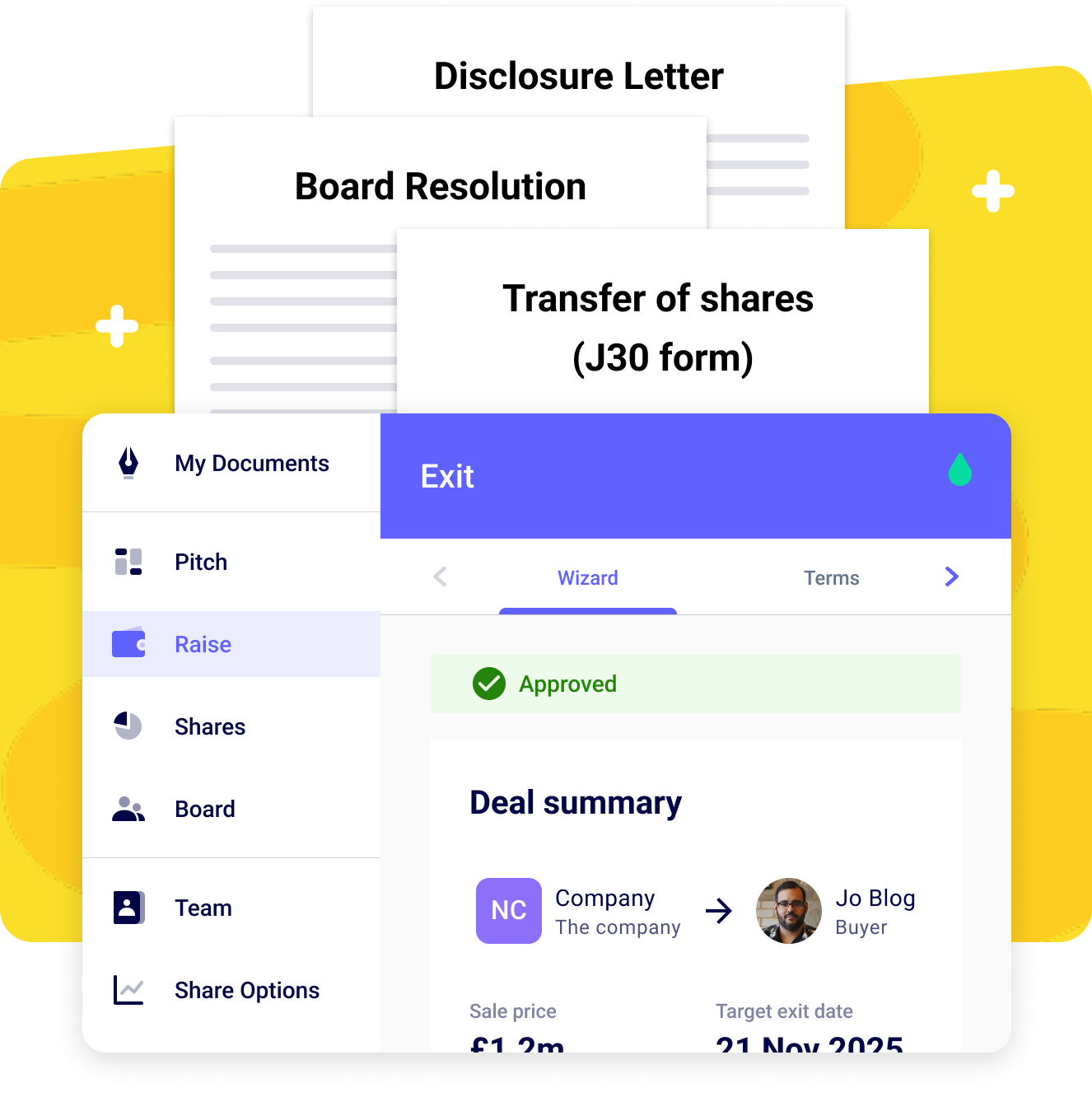 Ready to sell your startup? Our Exit service packages all the documents you need – from the Heads of Terms and Share Purchase Agreement to the J30 and new share certificates – with unlimited support from our friendly experts.