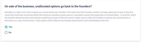 But when it comes to selling the company, if there are unallocated options remaining in the options pool, that doesn’t seem fair because the option pool was created by diluting the founders’ shareholding.