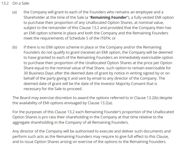 This wording has your existing shareholders and new investors all agree – and give their approval now, so you don’t have to fight for it later – to allow any unallocated options to be divided between the founders, and for the founders to get them as tax-advantaged EMI options, if the founders and company qualify for EMI at the time.