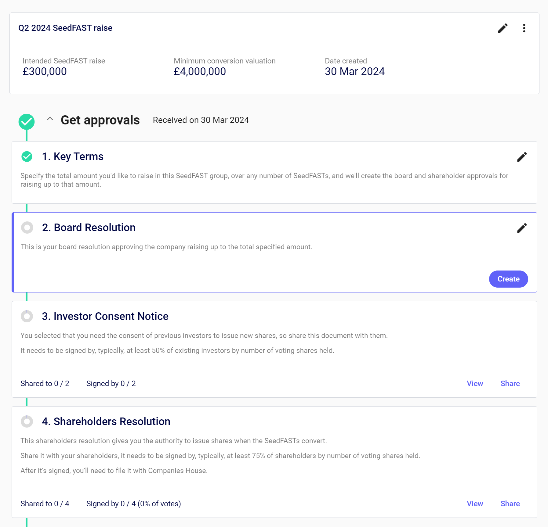 When you go to create your first SeedFAST, the platform will prompt you to enter the total amount you intend to raise, over any number SeedFASTs. You’ll also be asked to enter the minimum valuation that those SeedFASTs will convert at if you don’t do a new funding round before the SeedFASTs have to be converted at the longstop date (which is 6 months max if the investor is to get SEIS or EIS).
