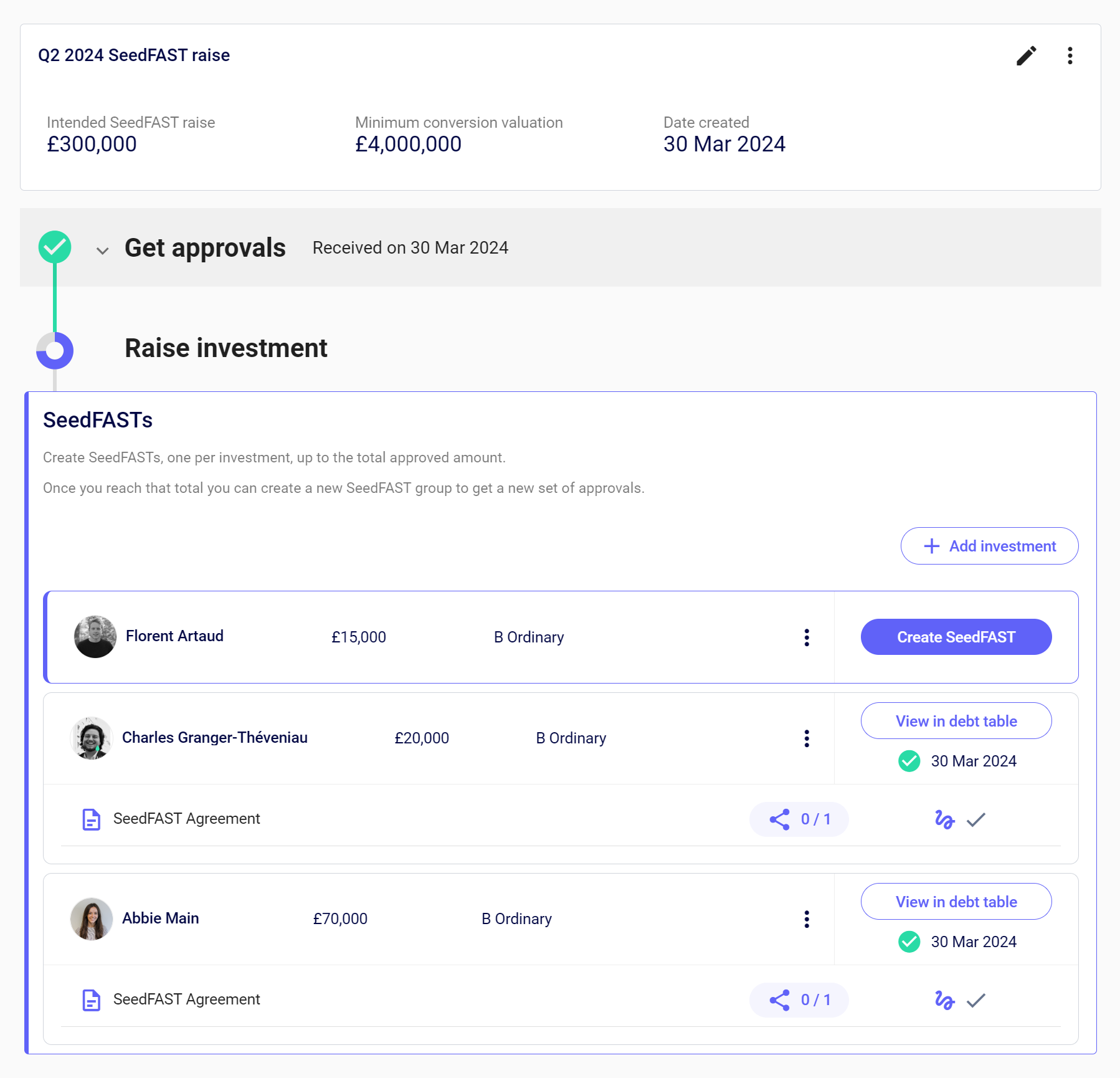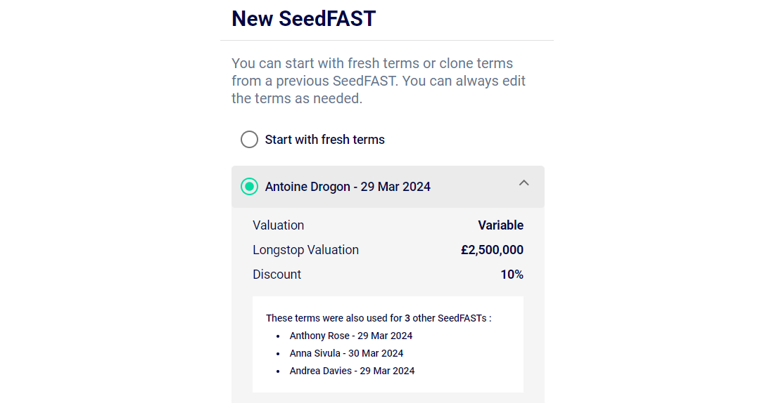 If you’re creating lots of SeedFASTs you can even clone the terms from a previous one, so the time to create an investment is under a minute.