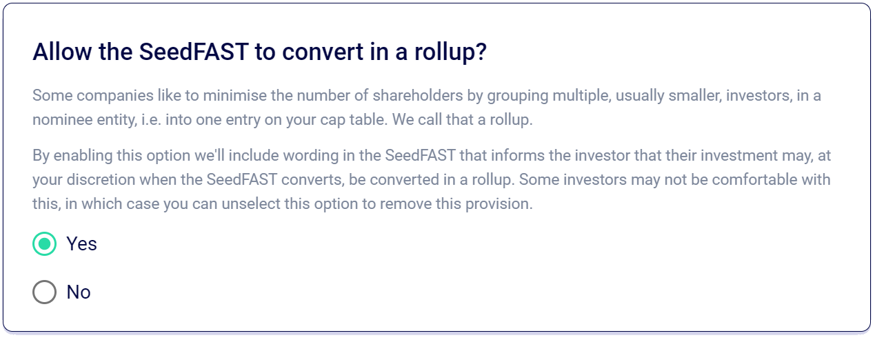 But, if you are raising from lots of small investors – a brilliant use case for SeedFASTs – we’ve added an option to allow the SeedFASTs to be converted in a rollup later.