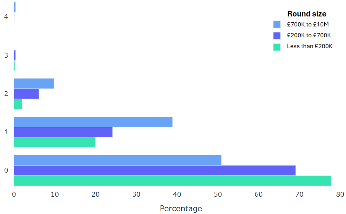 What’s behind this increase in board seats as round sizes go up? The most obvious reason is that the type of investor (friends and family, angel, fund) investing in the company varies with the size of the investment. This impacts the likelihood of whether they want an investor director appointment and whether the founder wants to give them one.