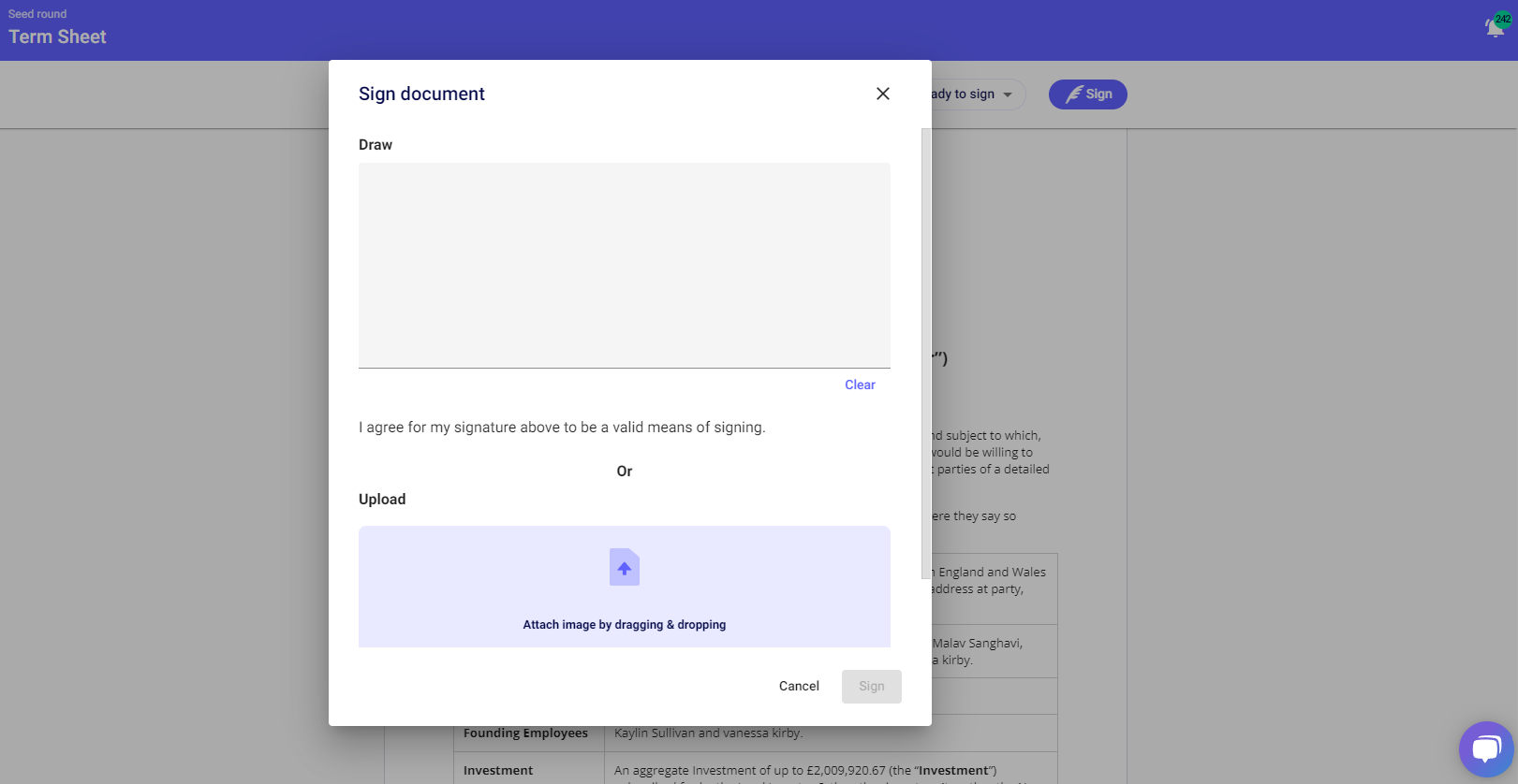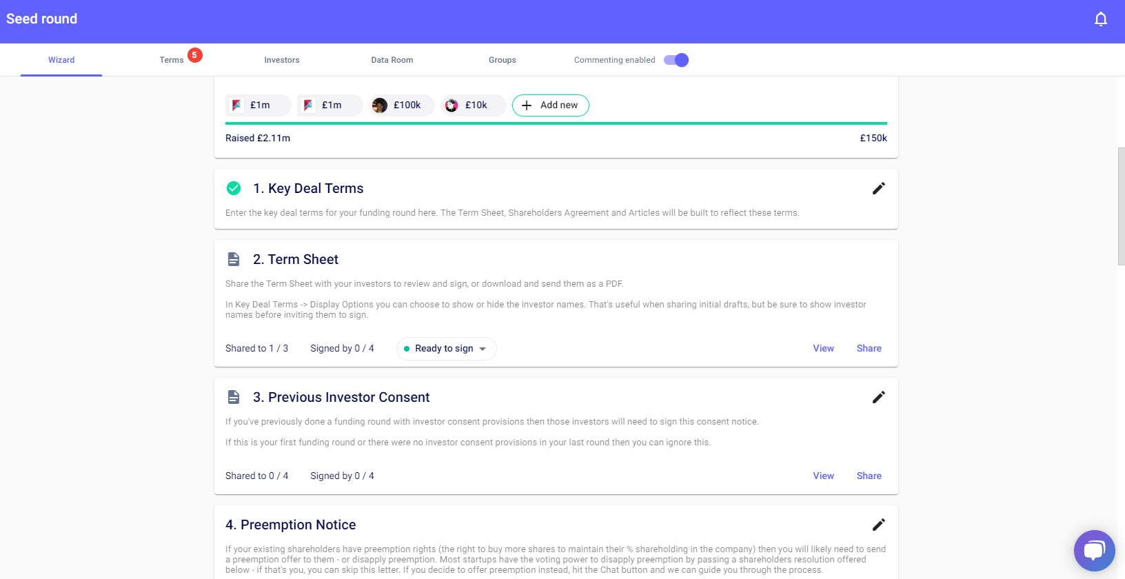 When you’ve agreed the term sheet with the founder on SeedLegals, you can e-sign it. The founder can then build the remaining deal documents on SeedLegals to complete the round.