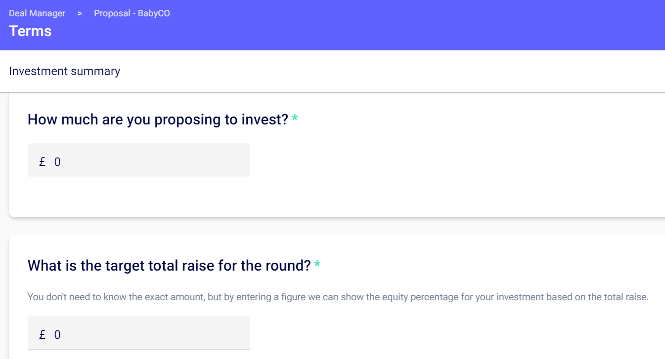 The first thing the founder needs to do after receiving your proposal is to complete the Term Sheet, based on the terms you proposed. The founder will be able to accept terms you propose or propose alternatives. Any misalignment on terms between founder and investor is highlighted to the founder on the platform as they build their term sheet.