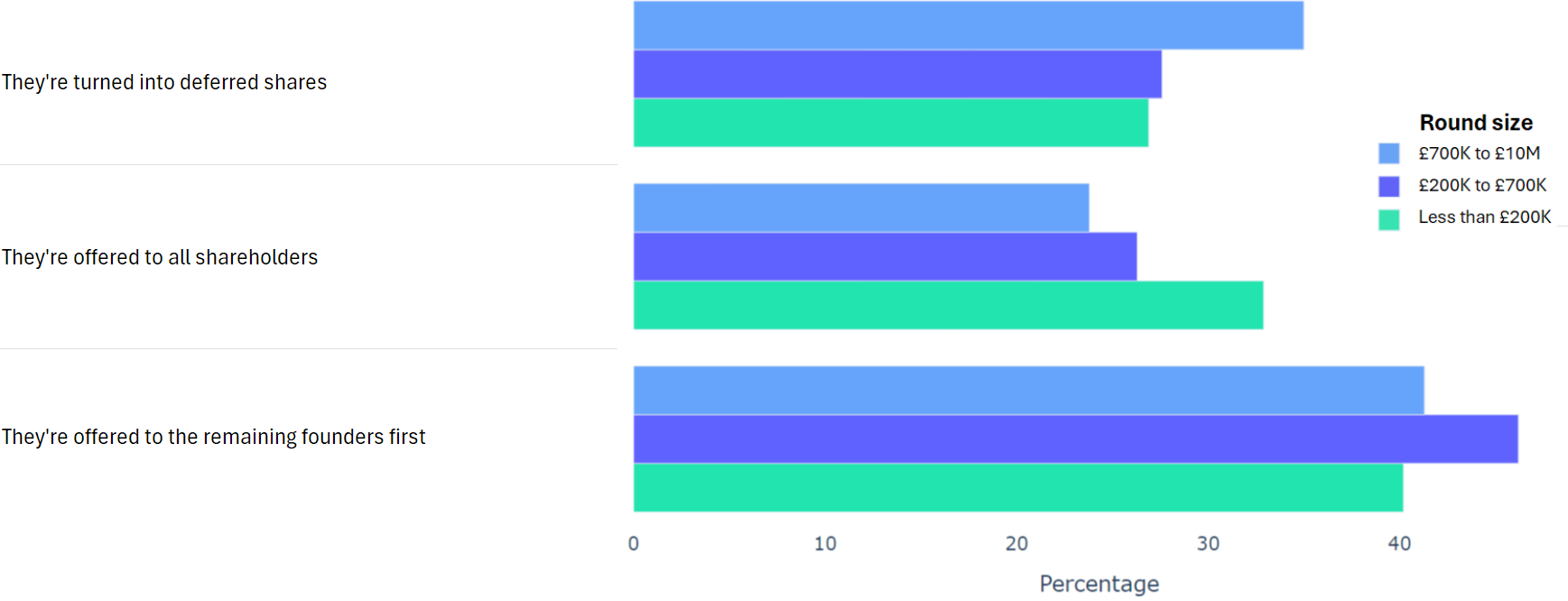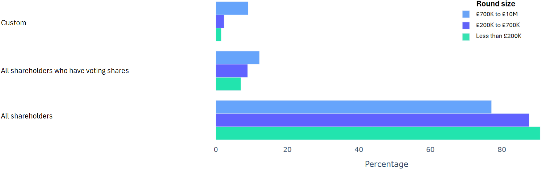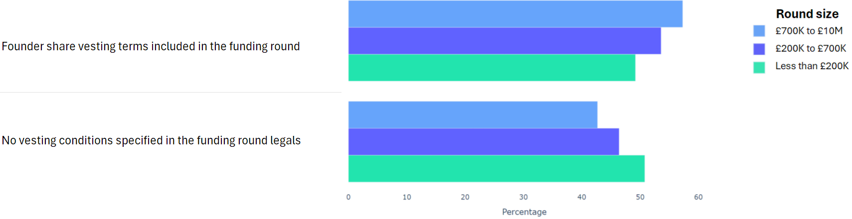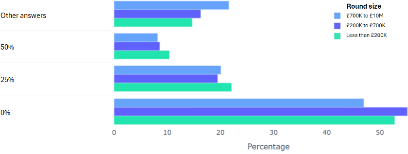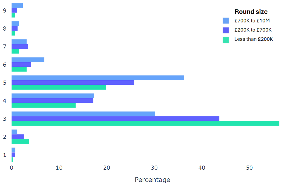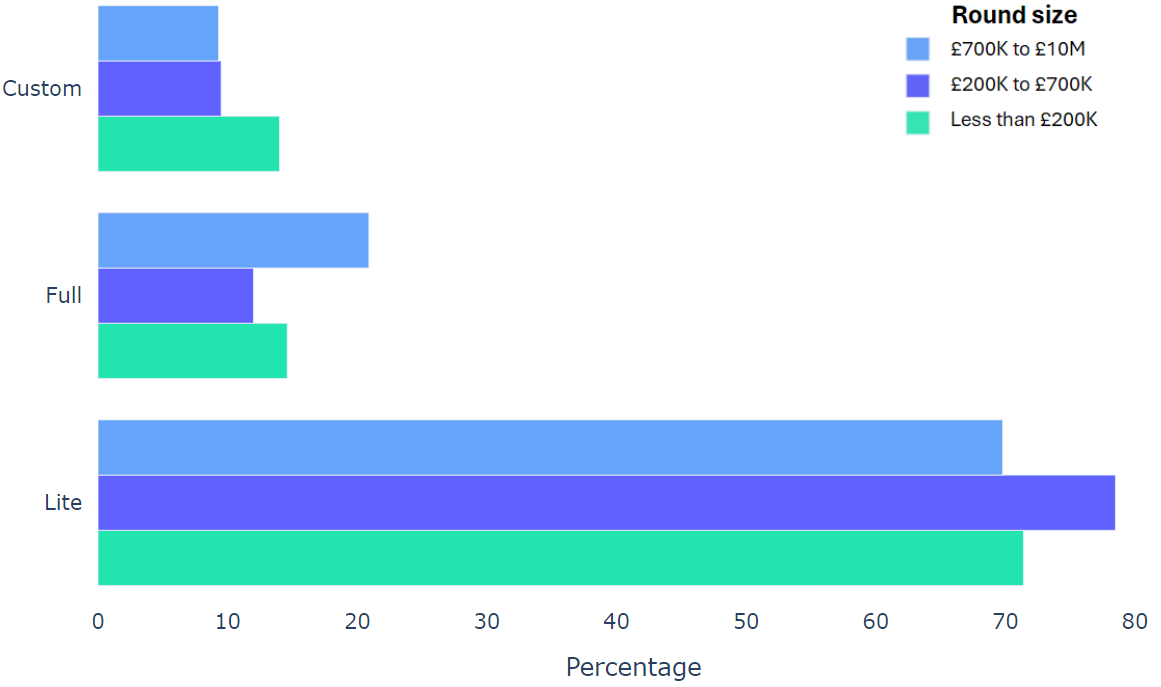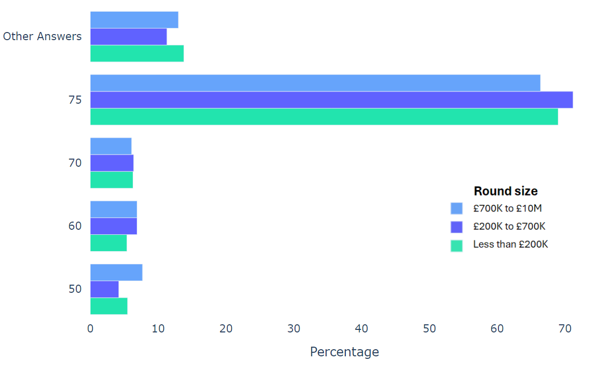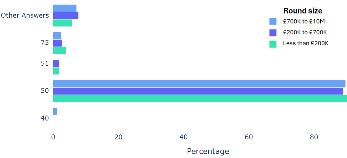 Using data from 2000+ funding rounds done on SeedLegals, we analysed each of the key terms that founders and investors negotiate in funding rounds done on SeedLegals. We then grouped those into Small (under £200K), Medium (raising £200K to £700K) and Large (£700K to £10M+) rounds. We then created histograms for each deal term, for each round size, to show you what’s market standard for your round.