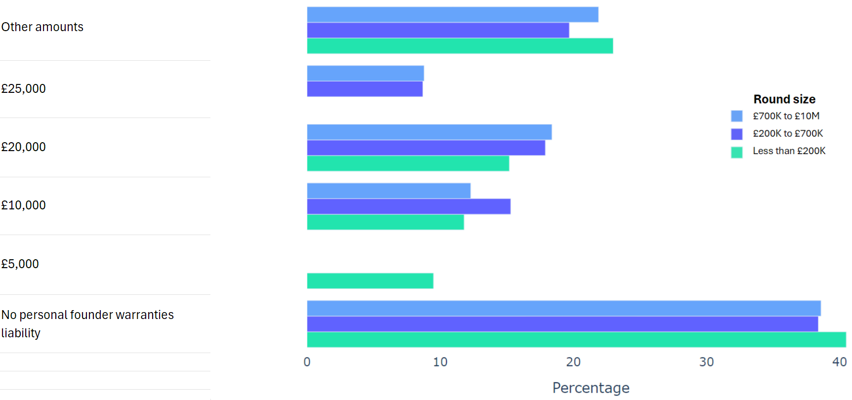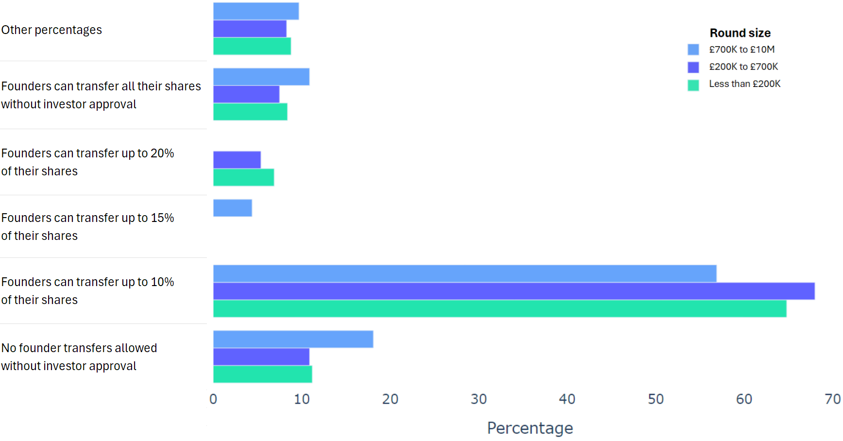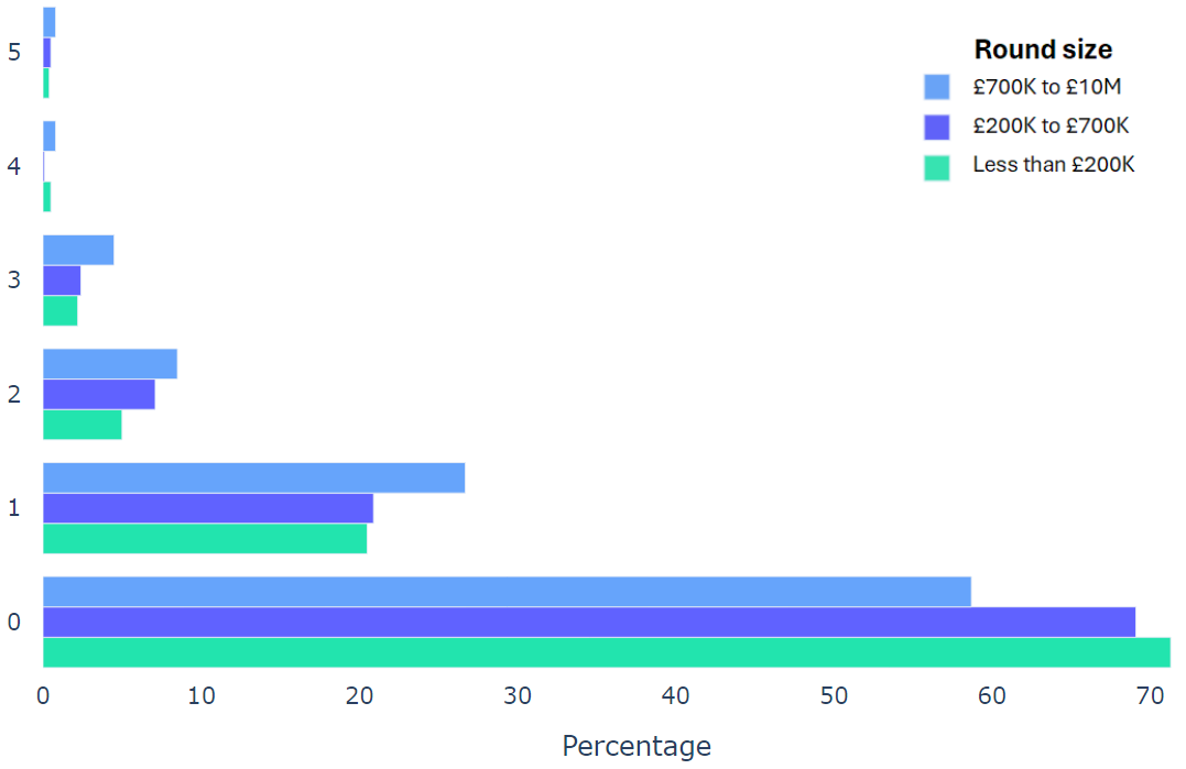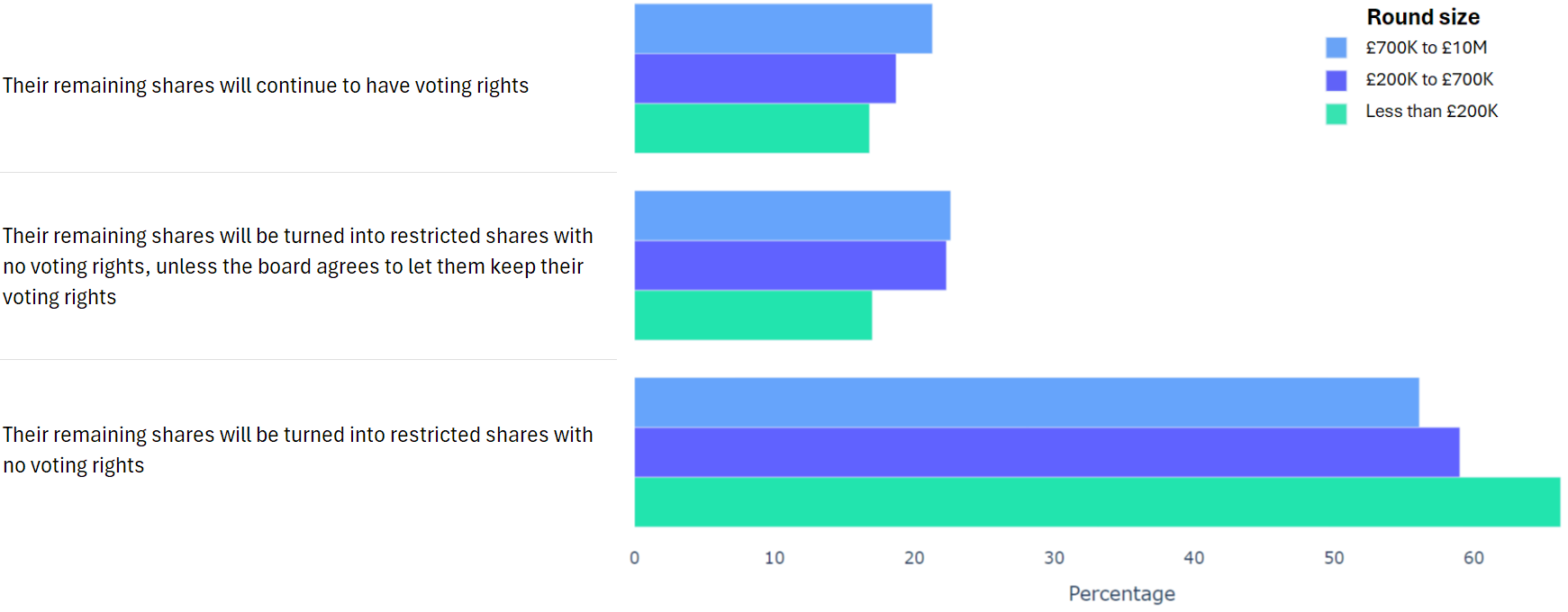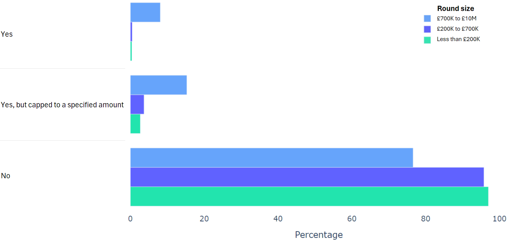 Using data from 2000+ funding rounds done on SeedLegals, we analysed each of the key terms that founders and investors negotiate in funding rounds done on SeedLegals. We then grouped those into Small (under £200K), Medium (raising £200K to £700K) and Large (£700K to £10M+) rounds. We then created histograms for each deal term, for each round size, to show you what’s market standard for your round.