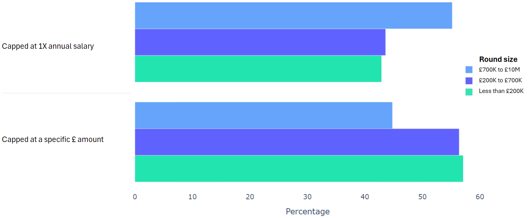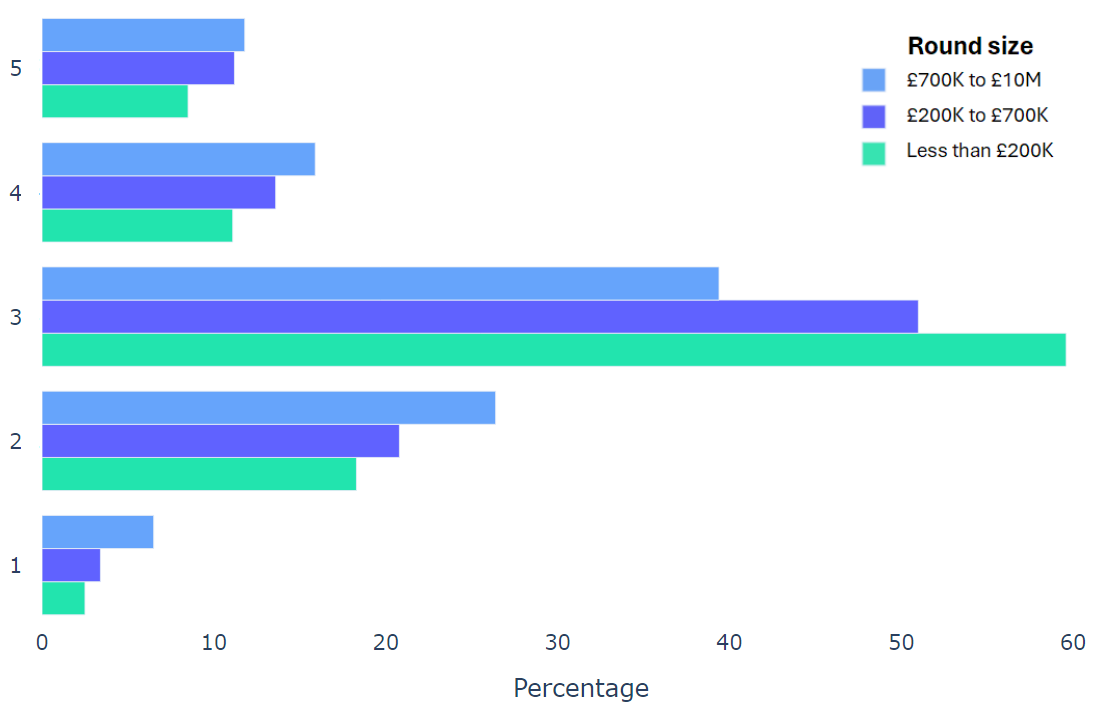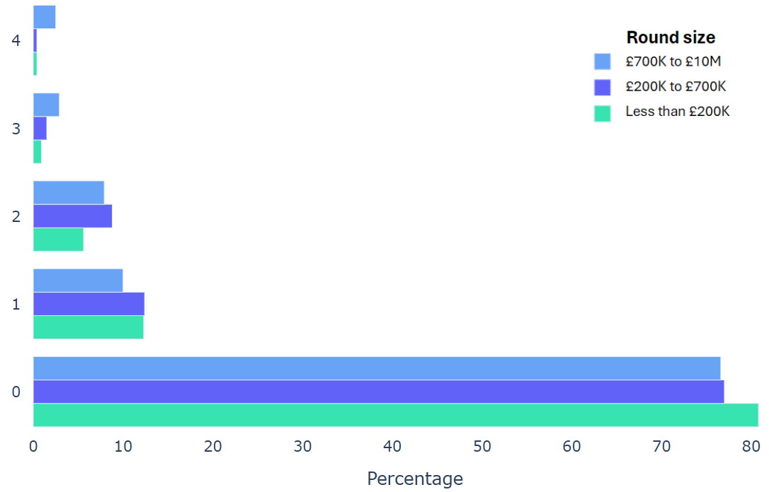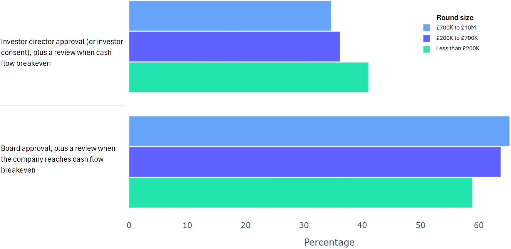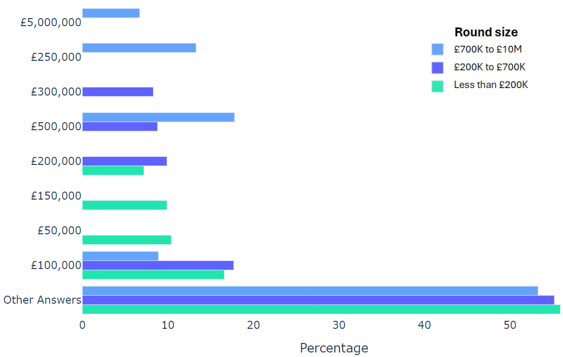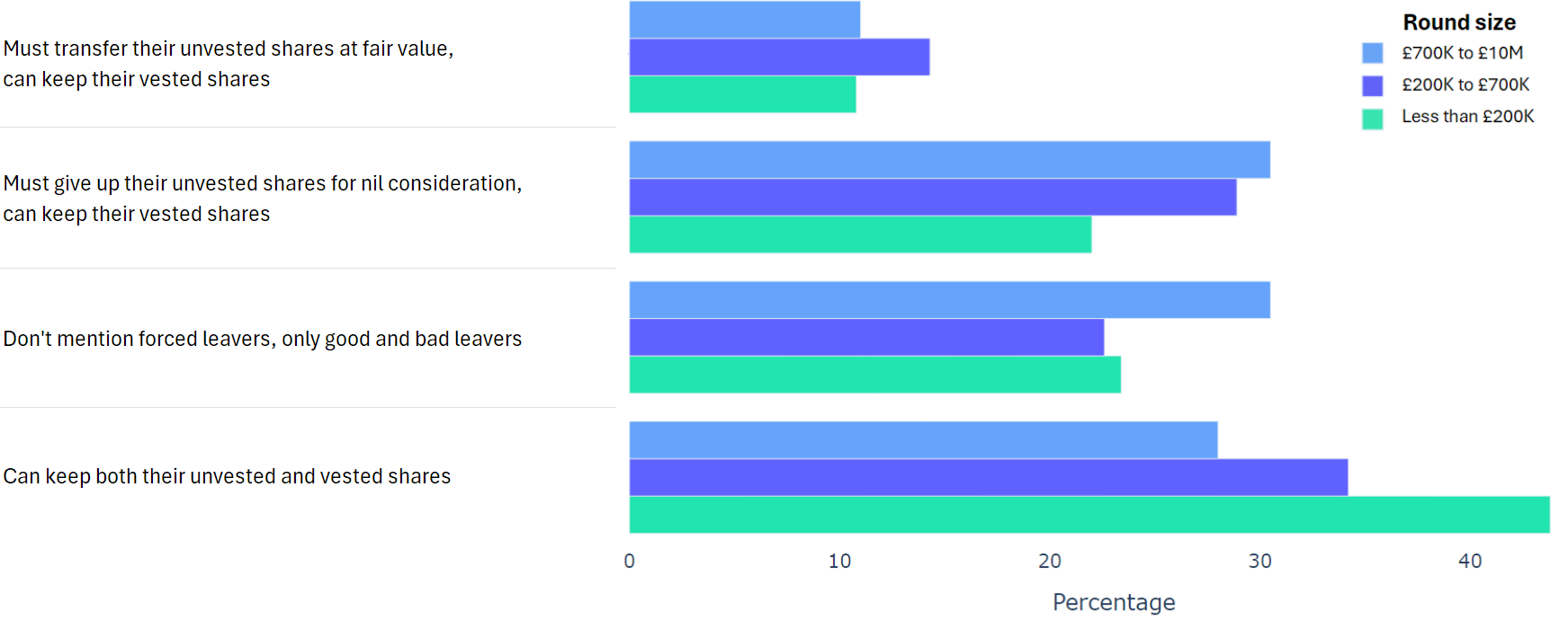 Using data from 2000+ funding rounds done on SeedLegals, we analysed each of the key terms that founders and investors negotiate in funding rounds done on SeedLegals. We then grouped those into Small (under £200K), Medium (raising £200K to £700K) and Large (£700K to £10M+) rounds. We then created histograms for each deal term, for each round size, to show you what’s market standard for your round.