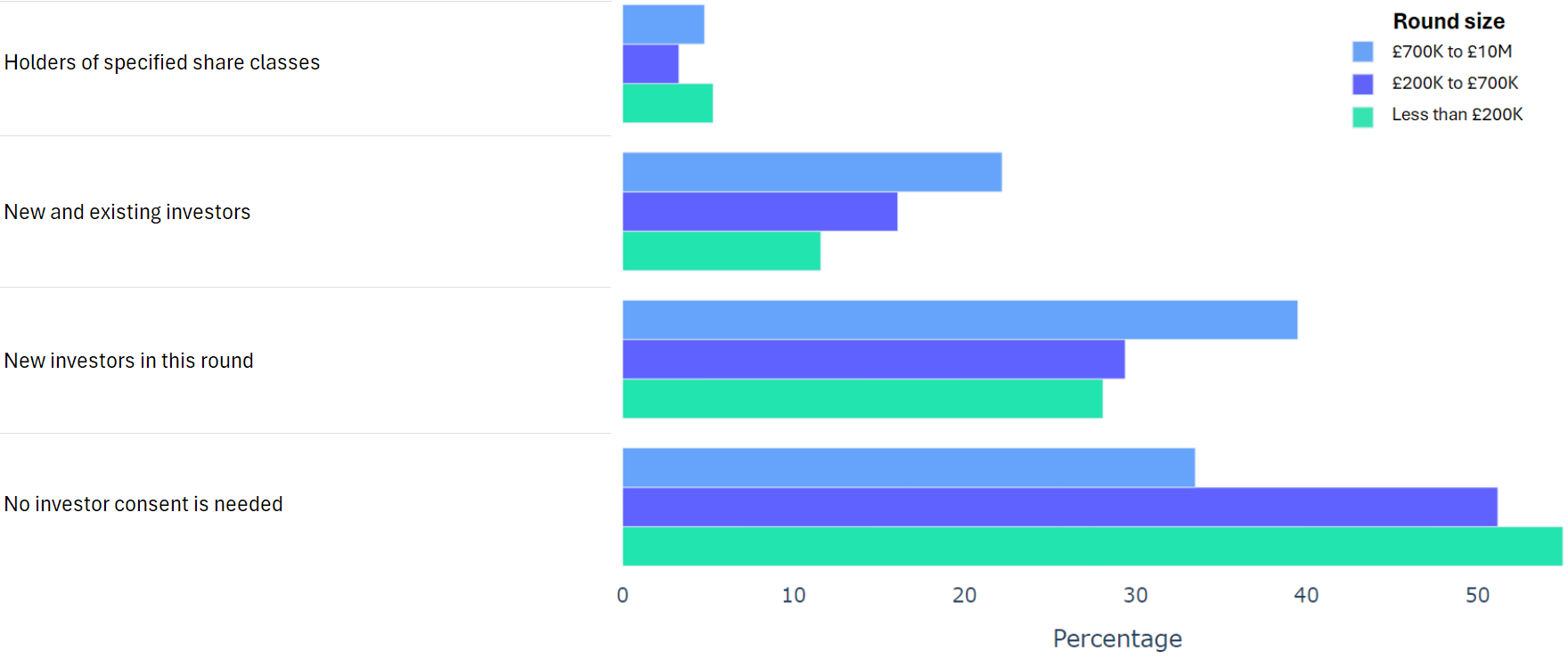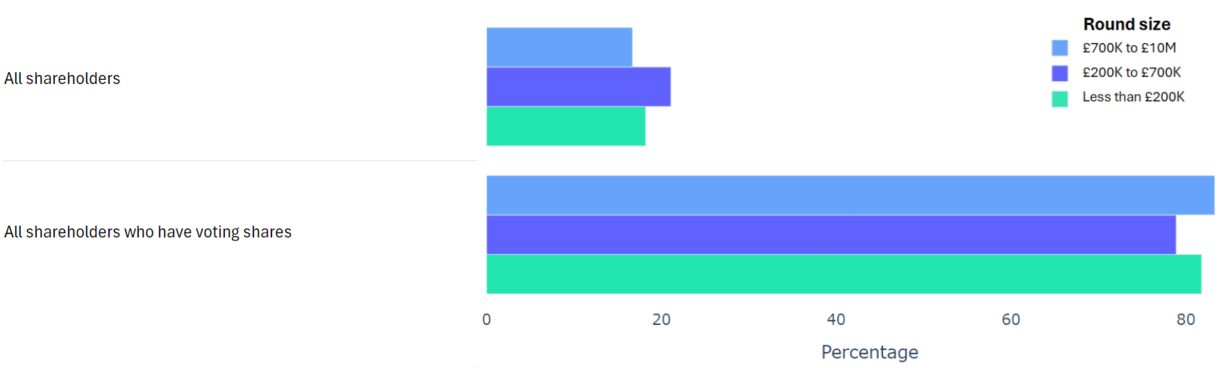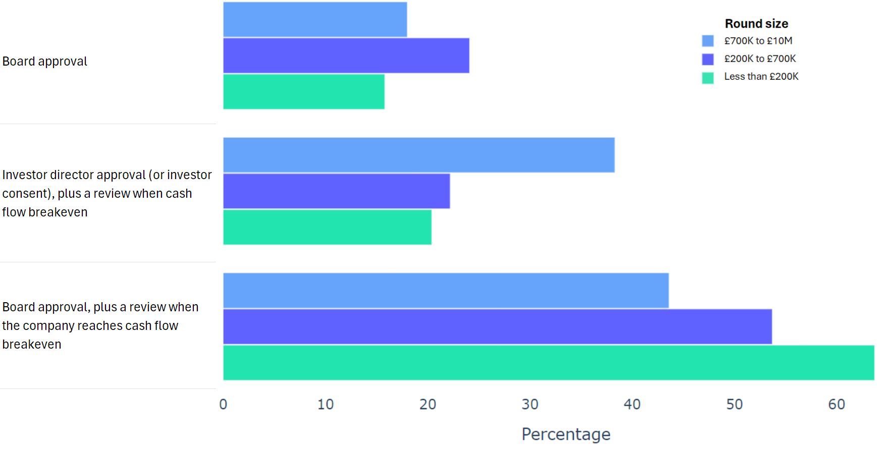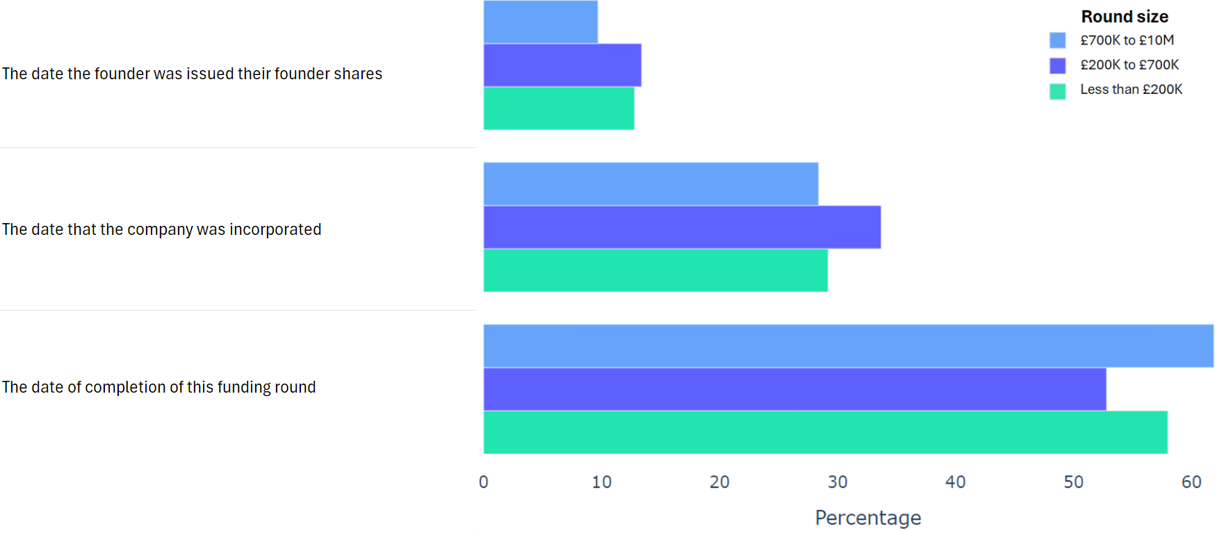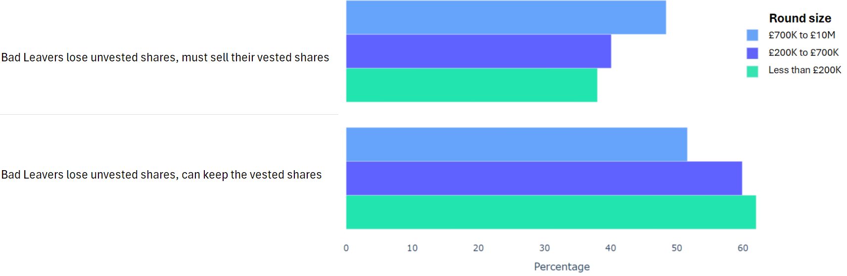 Using data from 2000+ funding rounds done on SeedLegals, we analysed each of the key terms that founders and investors negotiate in funding rounds done on SeedLegals. We then grouped those into Small (under £200K), Medium (raising £200K to £700K) and Large (£700K to £10M+) rounds. We then created histograms for each deal term, for each round size, to show you what’s market standard for your round.