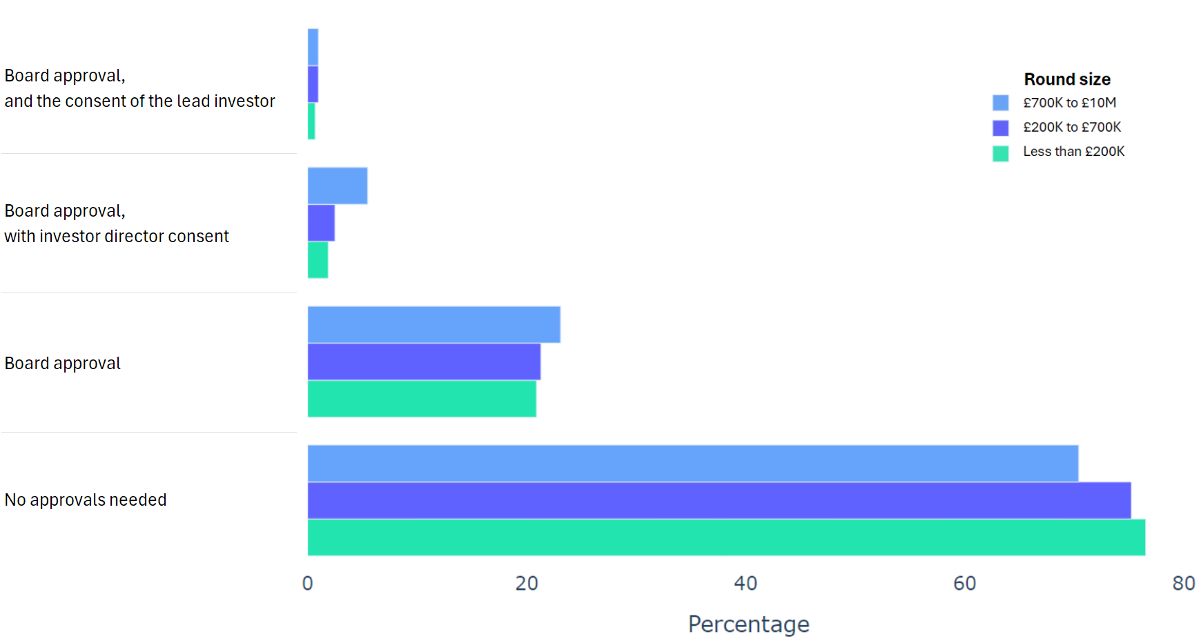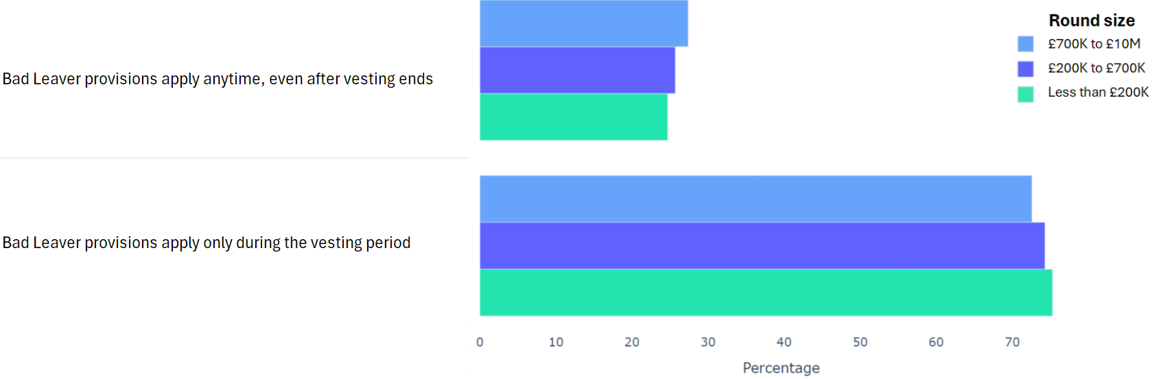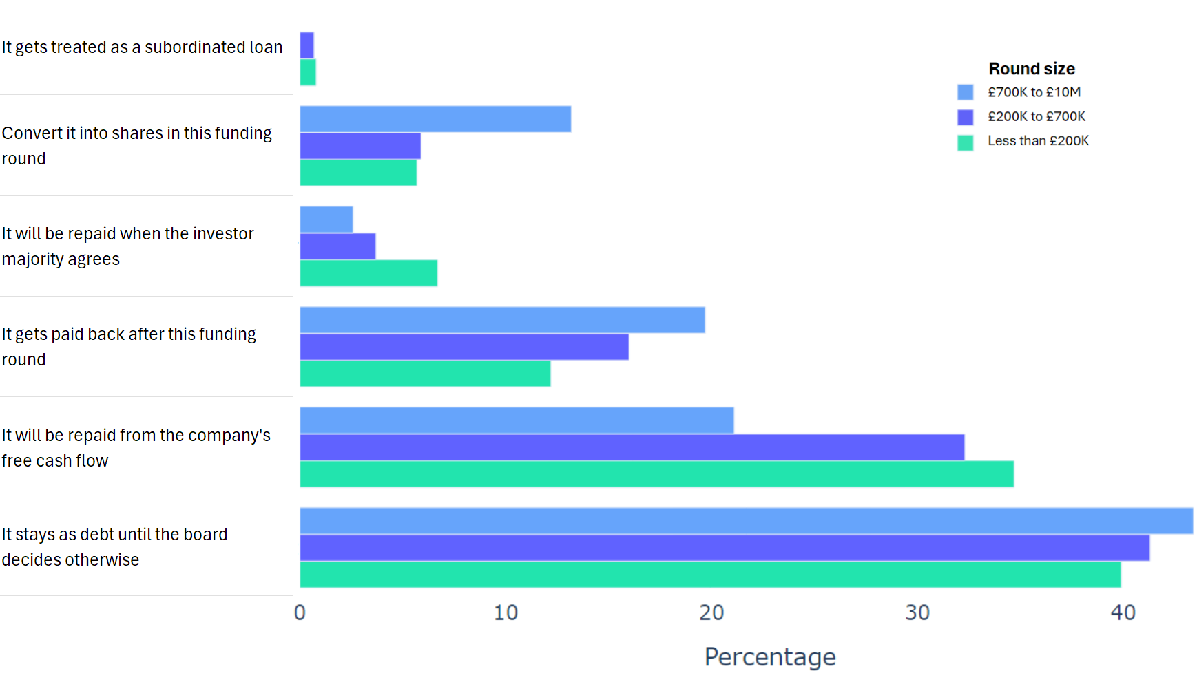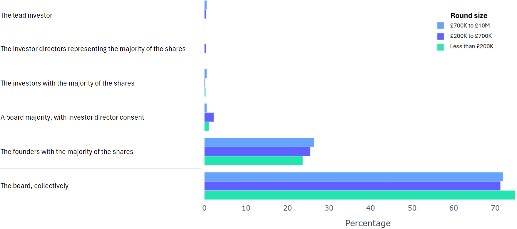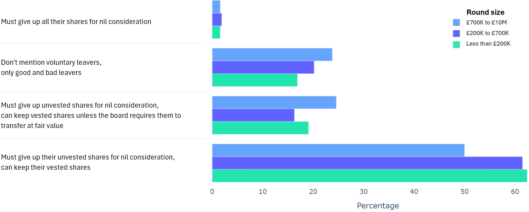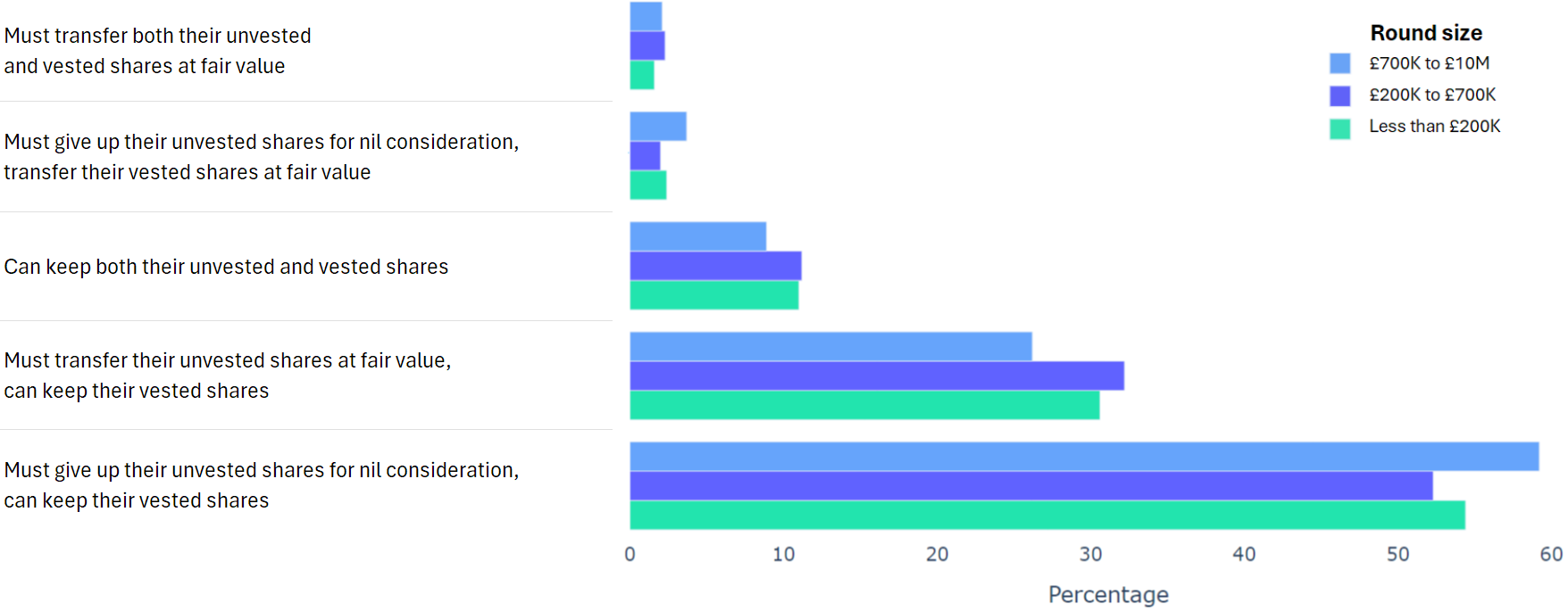 Using data from 2000+ funding rounds done on SeedLegals, we analysed each of the key terms that founders and investors negotiate in funding rounds done on SeedLegals. We then grouped those into Small (under £200K), Medium (raising £200K to £700K) and Large (£700K to £10M+) rounds. We then created histograms for each deal term, for each round size, to show you what’s market standard for your round.