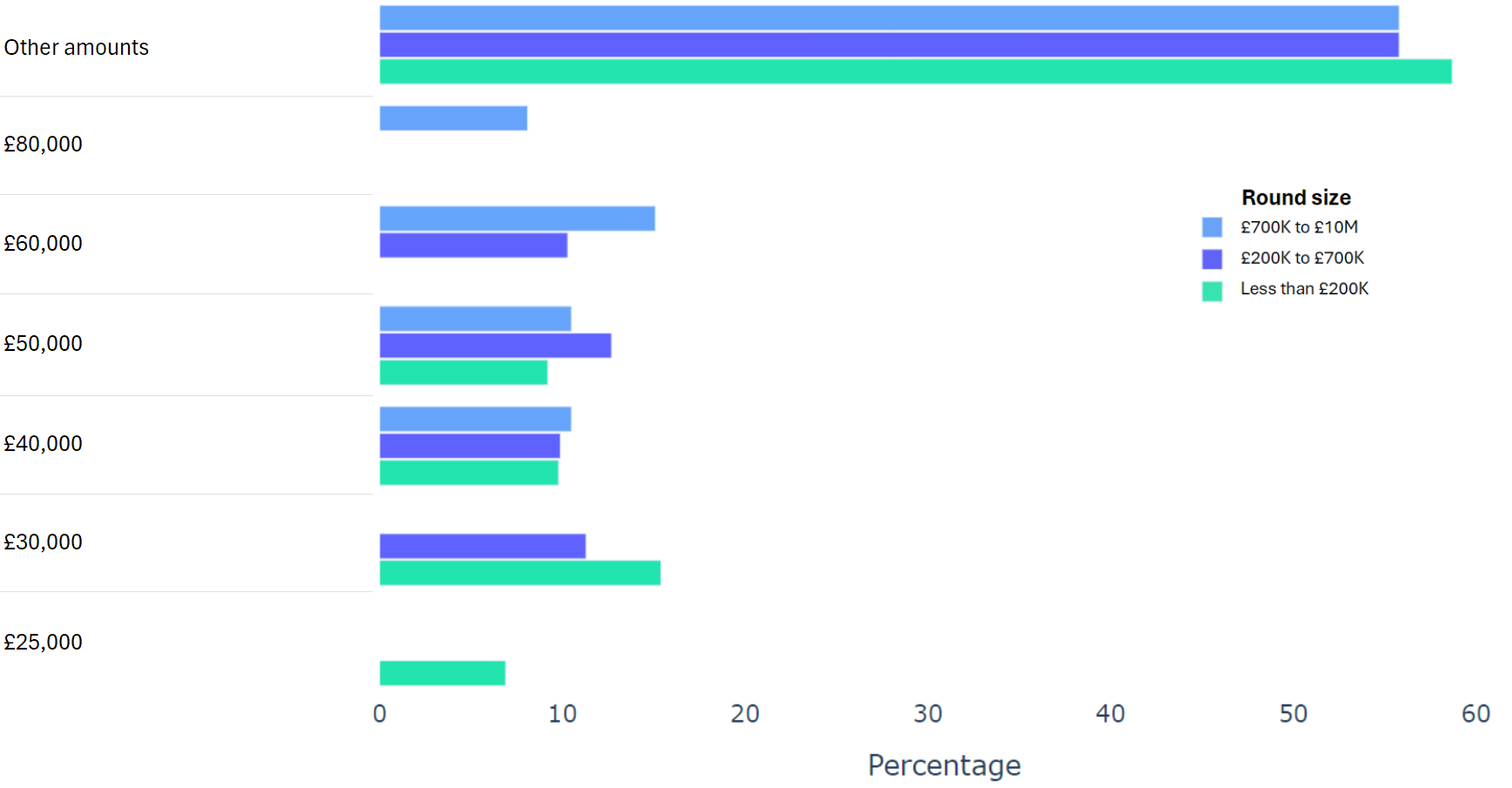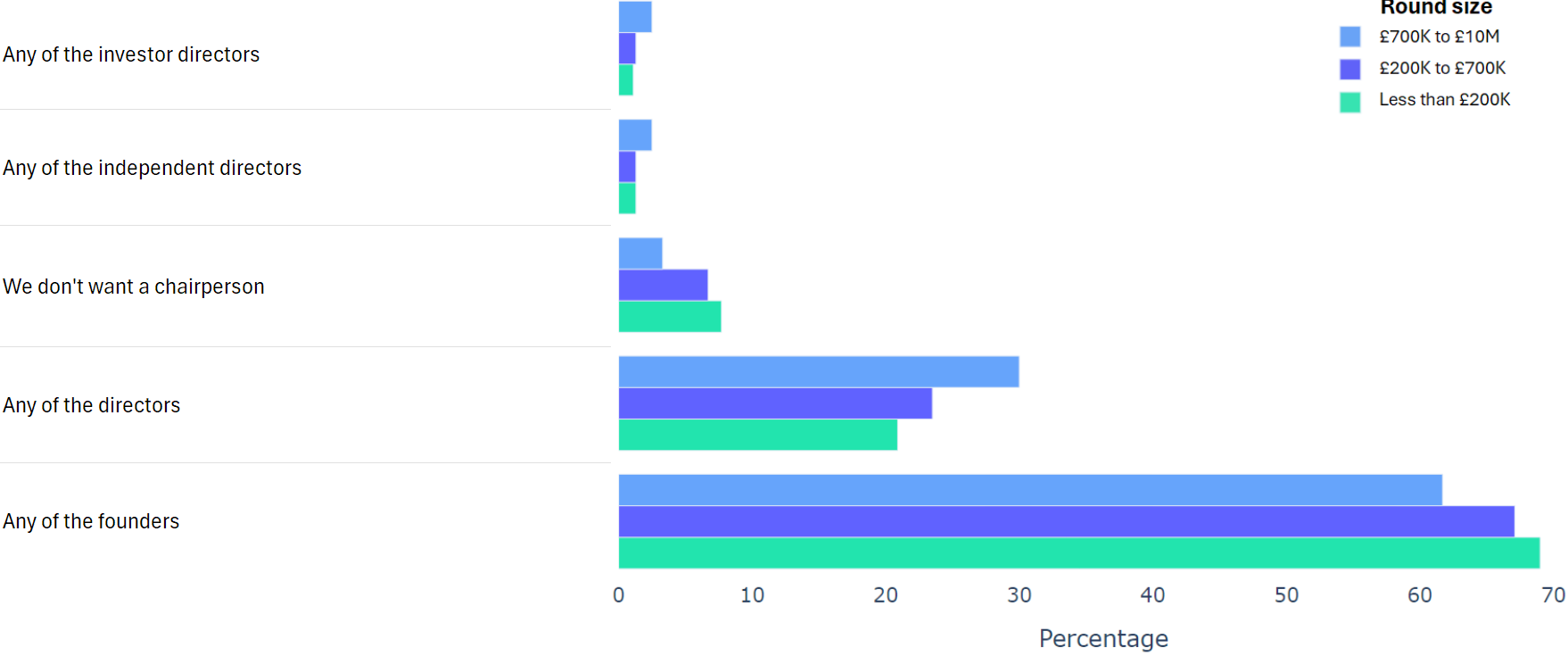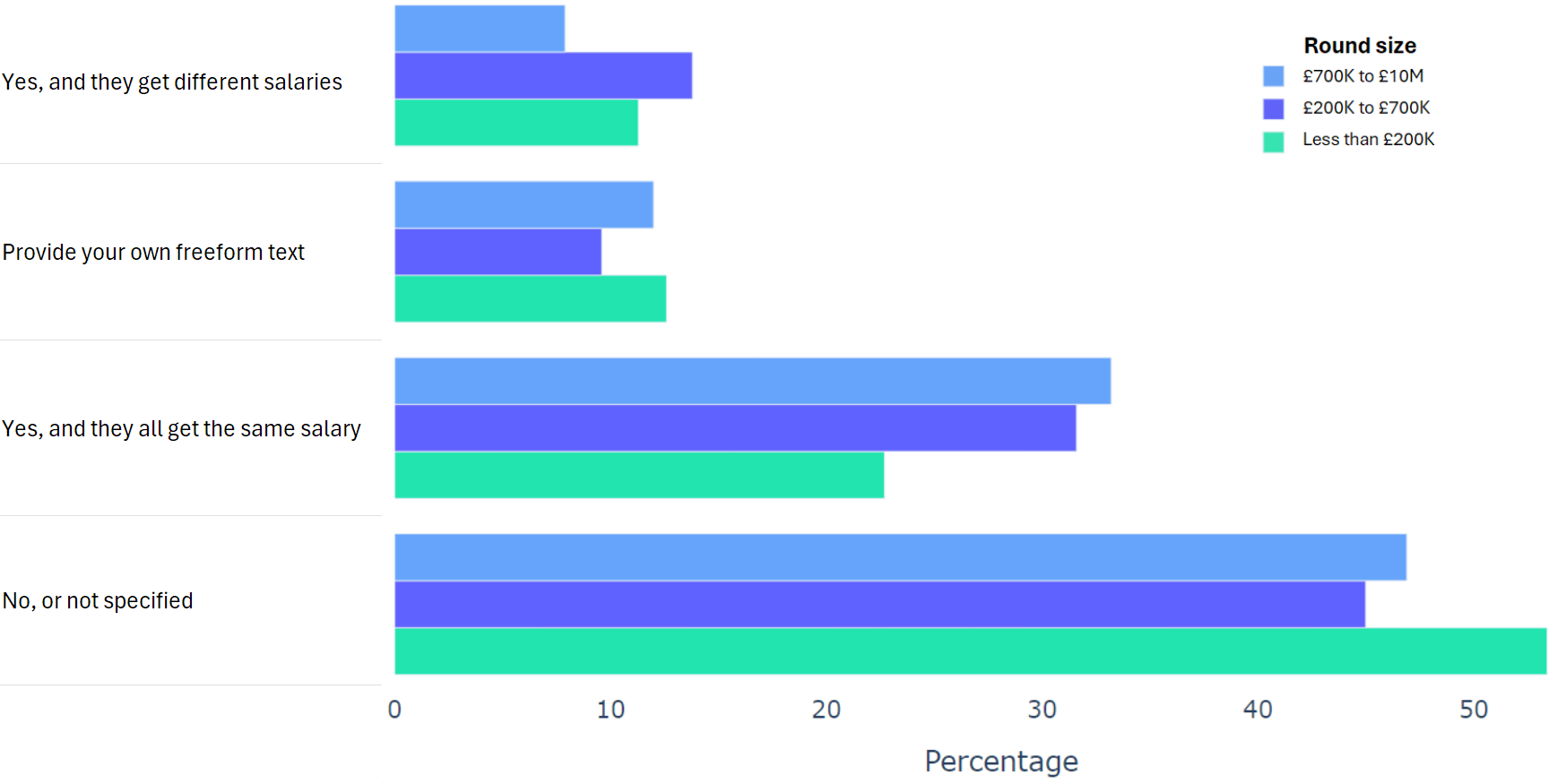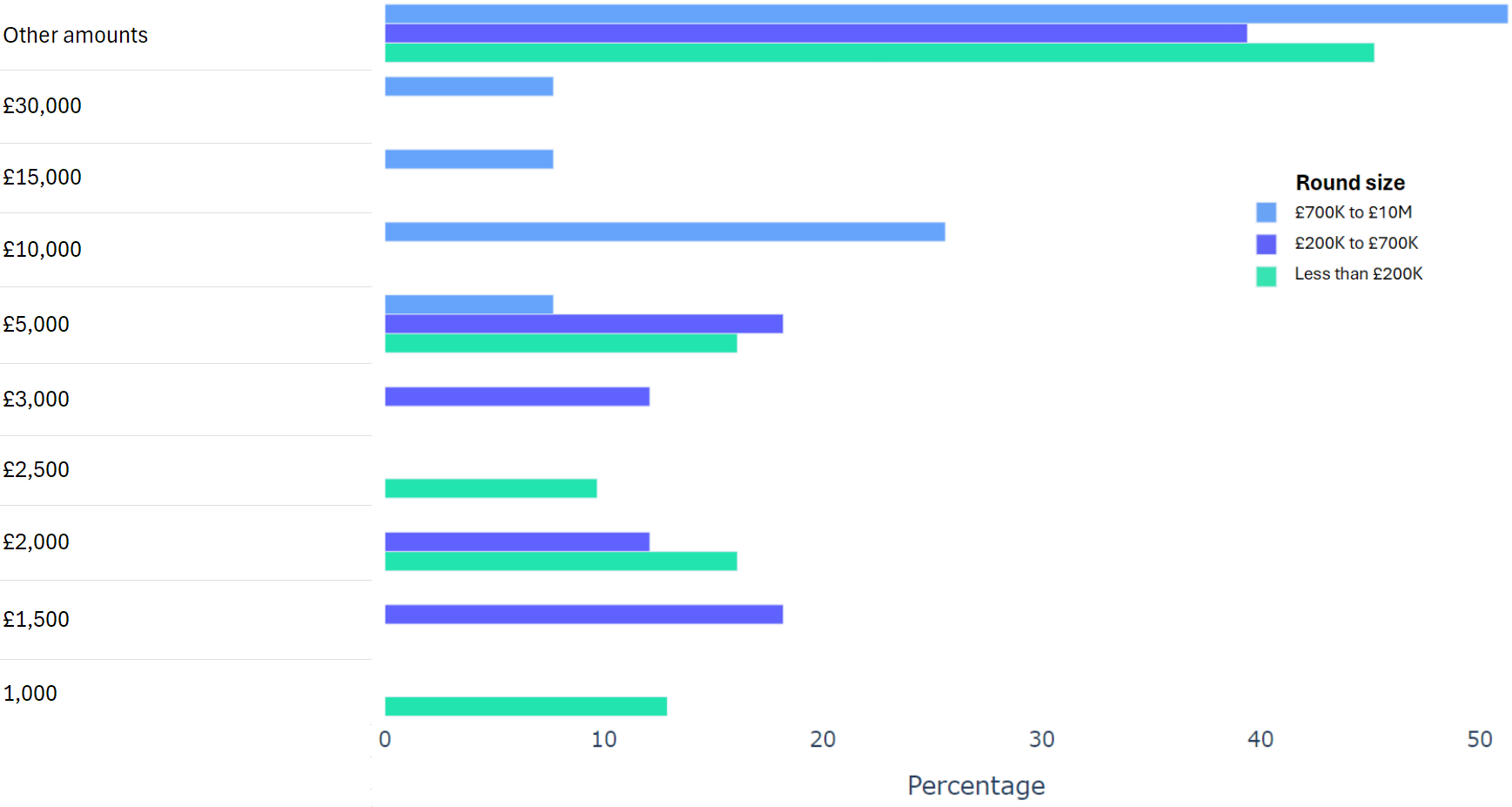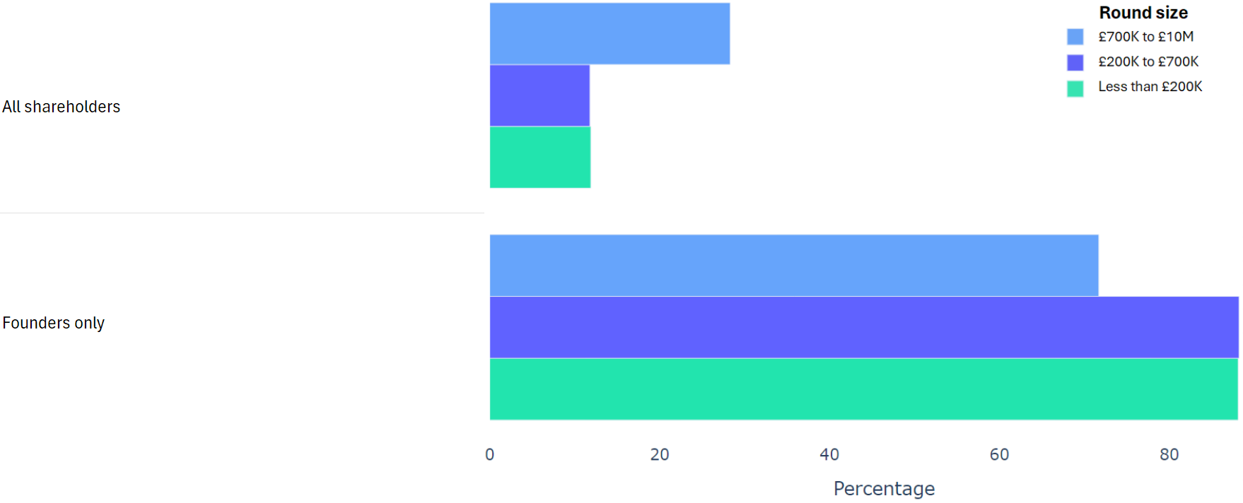 Using data from 2000+ funding rounds done on SeedLegals, we analysed each of the key terms that founders and investors negotiate in funding rounds done on SeedLegals. We then grouped those into Small (under £200K), Medium (raising £200K to £700K) and Large (£700K to £10M+) rounds. We then created histograms for each deal term, for each round size, to show you what’s market standard for your round.